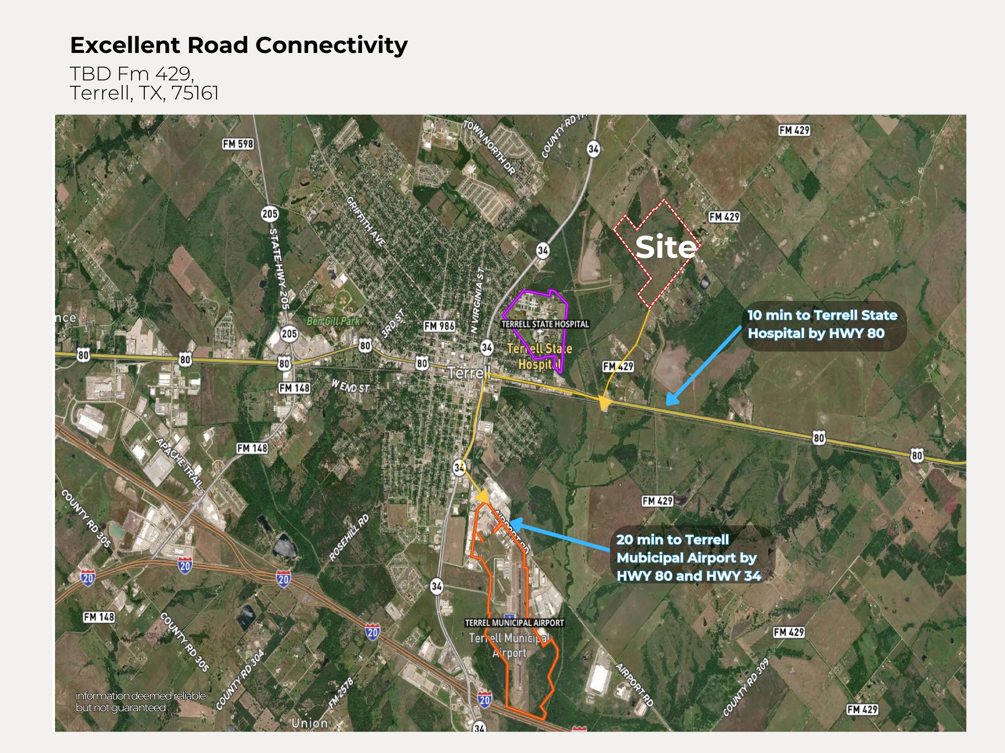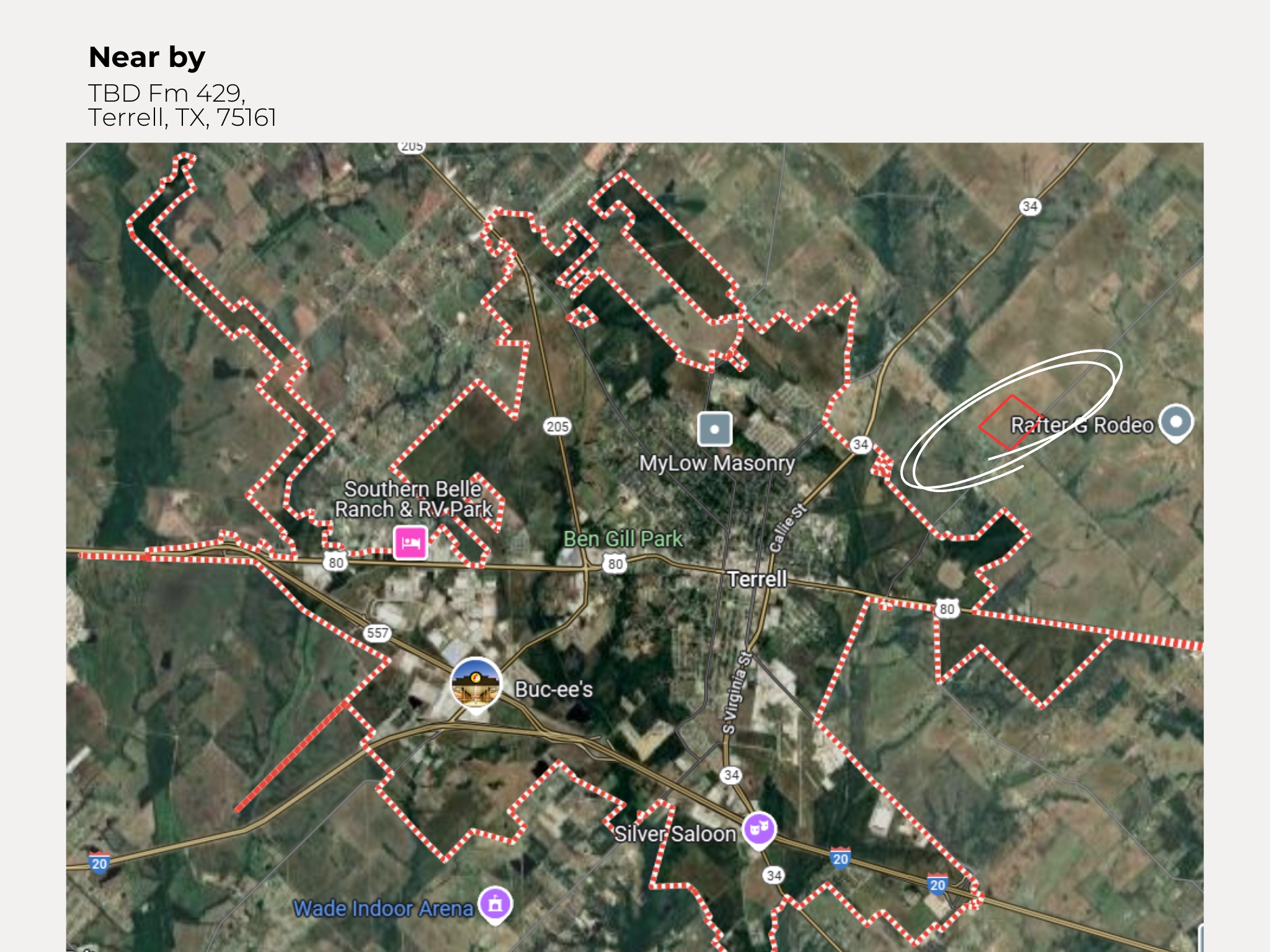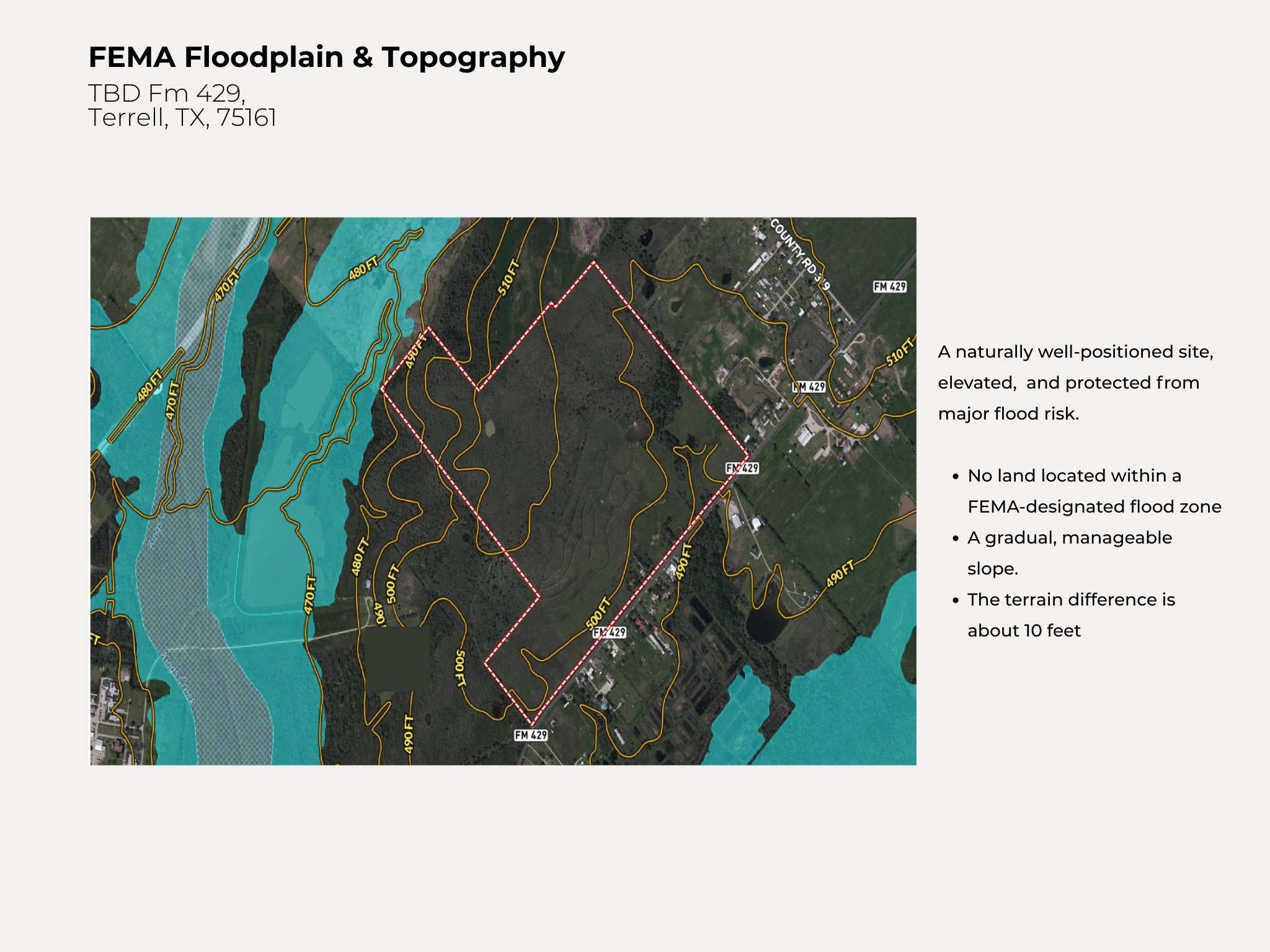New road planning. It will be expanded from two lanes to six lanes. No land located within a FEMA-designated flood zone. A gradual, manageable slope. The terrain difference is about 10 feet. Property sits within the ETJ of Terrell, offering development flexibility outside city limits and fewer zoning restrictions.