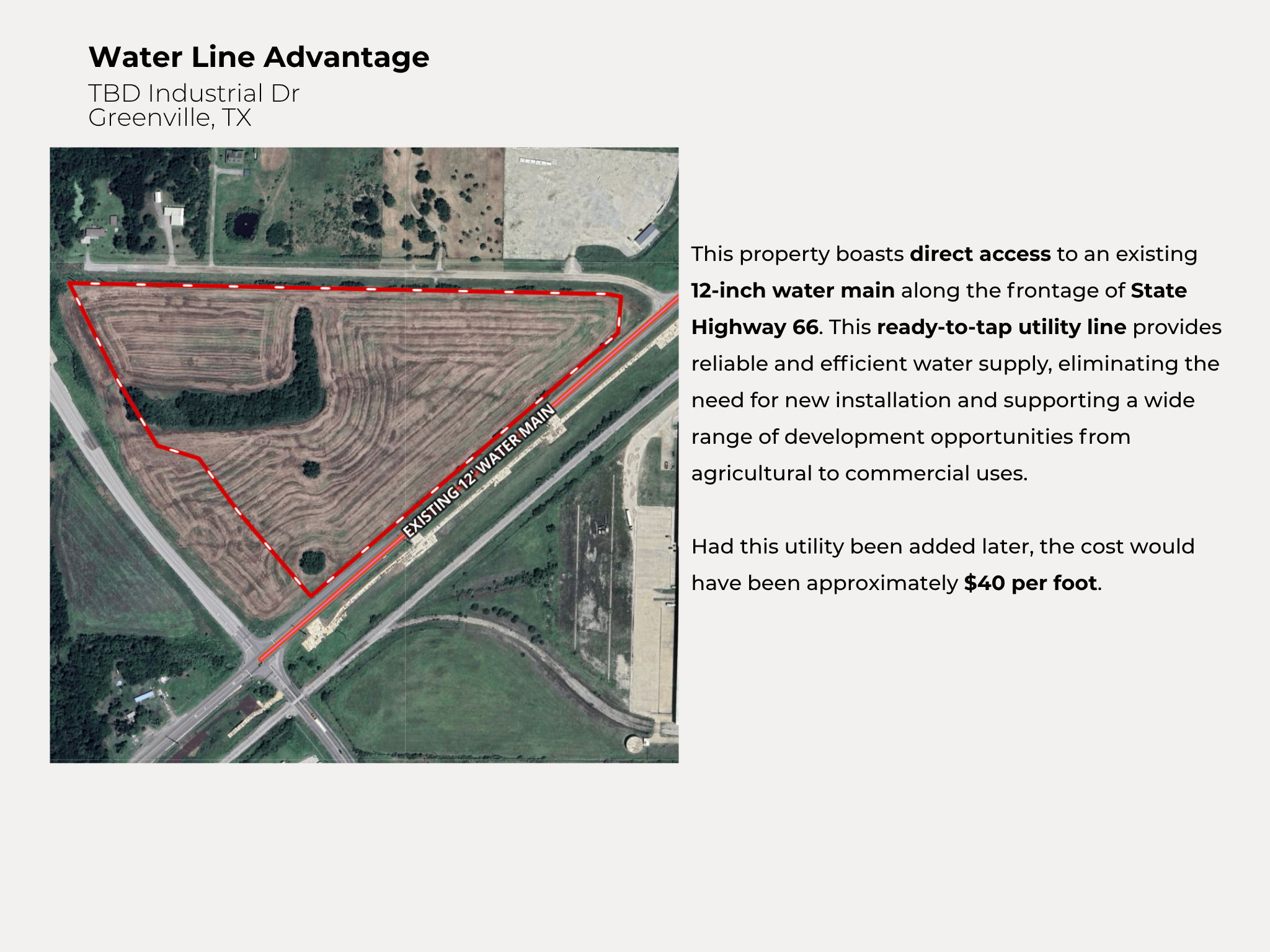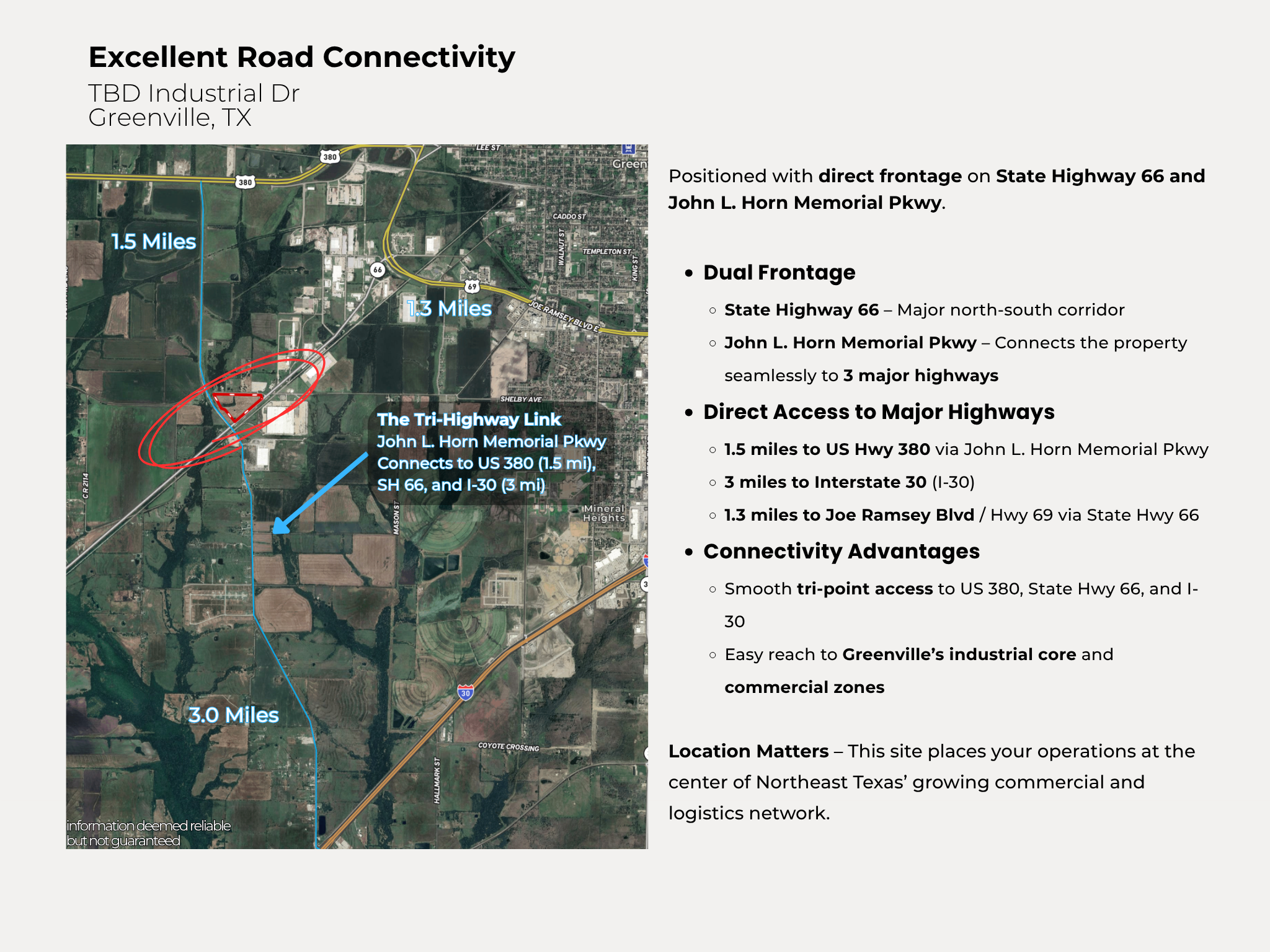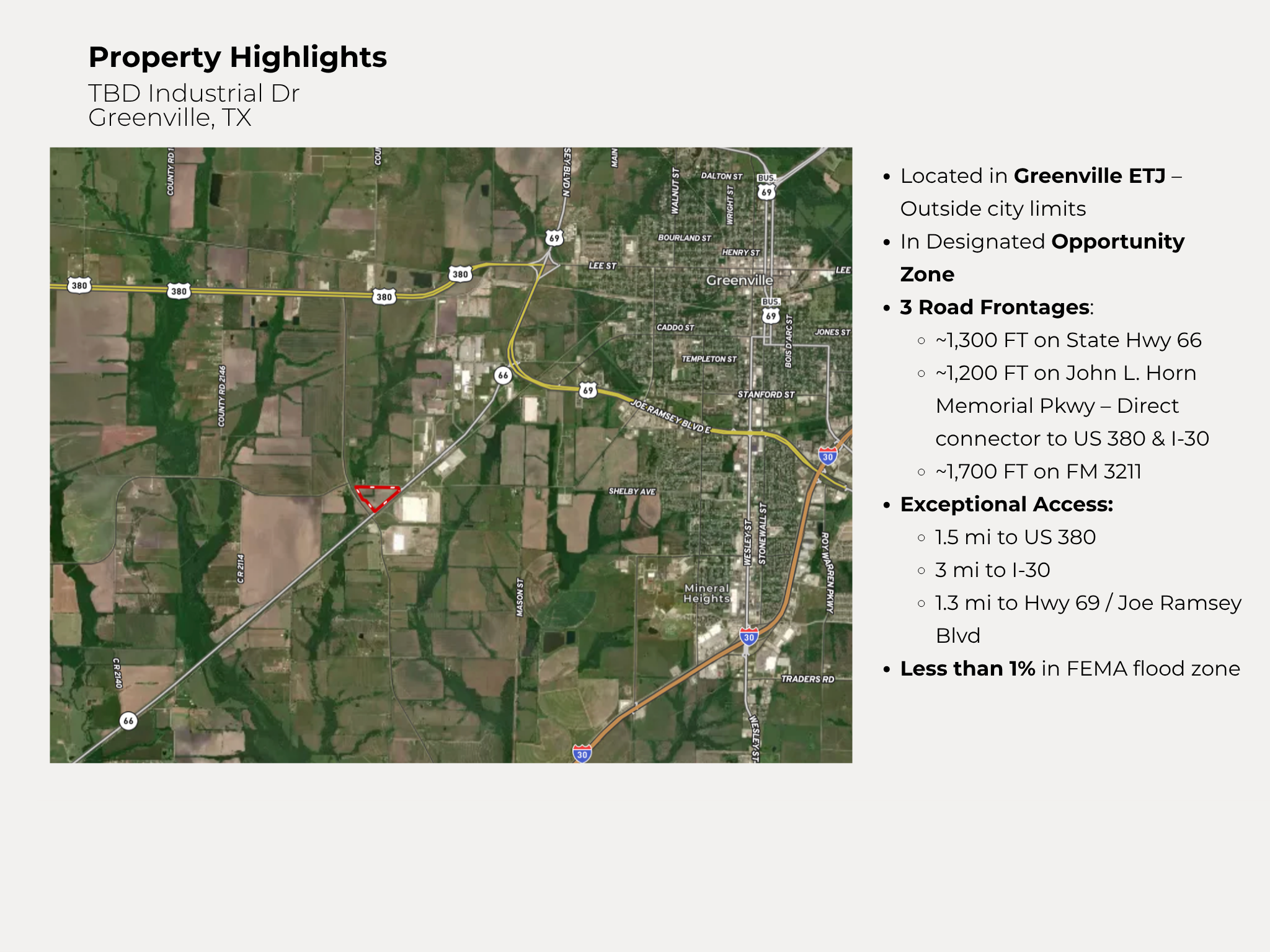 Located in Greenville ETJ – Outside city limits In Designated Opportunity Zone 3 Road Frontages: ~1,300 FT on State Hwy 66 ~1,200 FT on John L. Horn Memorial Pkwy – Direct connector to US 380 & I-30 ~1,700 FT on Private road Exceptional Access: 1.5 mi to US 380 3 mi to I-30 1.3 mi to Hwy 69 / Joe Ramsey Blvd Less than 1% in FEMA flood zone Positioned with direct frontage on State Highway 66 and John L. Horn Memorial Pkwy. Dual Frontage State Highway 66 – Major north-south corridor John L. Horn Memorial Pkwy – Connects the property seamlessly to 3 major highways Direct Access to Major Highways 1.5 miles to US Hwy 380 via John L. Horn Memorial Pkwy 3 miles to Interstate 30 (I-30) 1.3 miles to Joe Ramsey Blvd / Hwy 69 via State Hwy 66 Connectivity Advantages Smooth tri-point access to US 380, State Hwy 66, and I-30 Easy reach to Greenville’s industrial core and commercial zones Location Matters – This site places your operations at the center of Northeast Texas’ growing commercial and logistics network. Property sits within the ETJ of Greenville, offering development flexibility outside city limits and fewer zoning restrictions. Also Located in a Federally Designated Opportunity Zone: Deferral of capital gains taxes Reduction of capital gains for long-term holds Potential elimination of taxes on new gains after 10 years ⚡️ Invest with impact — and benefit from one of the most powerful tax tools available today.
